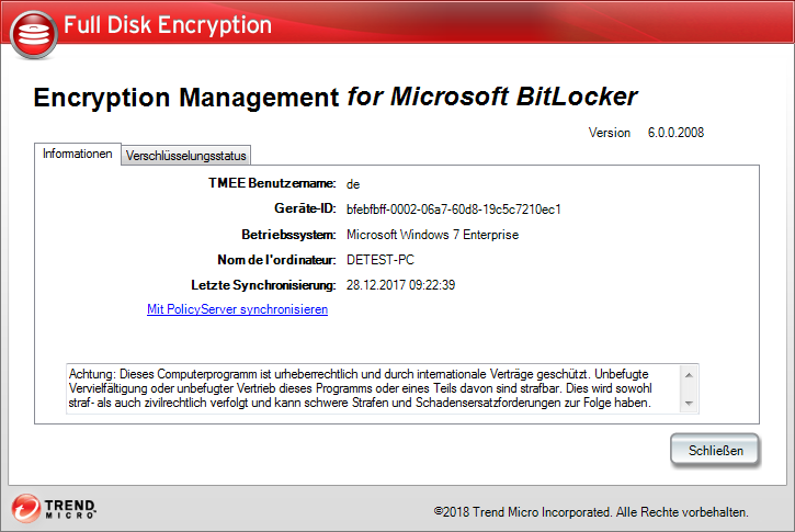 Auf der Registerkarte Informationen finden Sie ausführliche Informationen zum Benutzerkonto, zum Endpoint Encryption Gerät und zur Richtliniensynchronisierung. Weitere Informationen finden Sie im nachfolgenden Diagramm und in der Beschreibung.