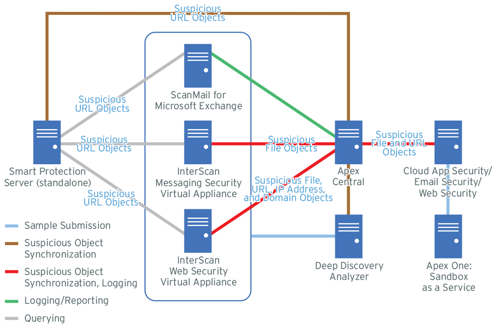 The Connected Threat Defense strategy integrates many Trend Micro products. The following diagrams illustrate how the major products interact.