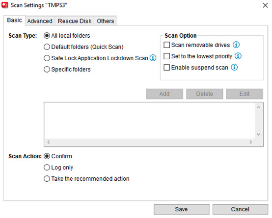 Scan Type: Specify the folder locations to scan, whether to scan only file types vulnerable to malware, or only Safe Lock Application Lockdown Scan violations