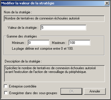 En utilisant les paramètres définis dans les champs Gamme des stratégies, indiquez le nombre de tentatives d'authentification infructueuses autorisé par utilisateur dans le champ Valeur de la stratégie.