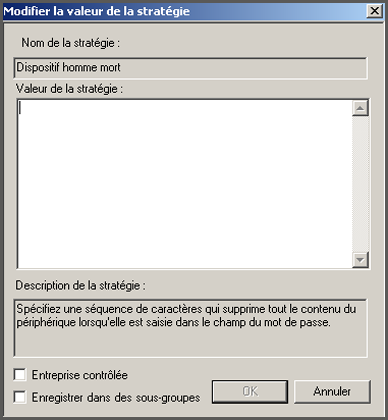 Certaines stratégies disposent d'une chaîne de texte modifiable pour les arguments de tableaux uniques. La stratégie Dispositif homme mort est un exemple de stratégie donnant la possibilité de spécifier une chaîne de texte.
