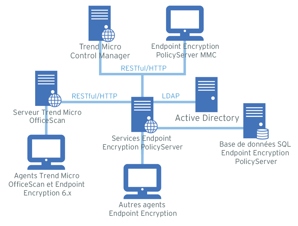 L'illustration suivante montre comment déployer Endpoint Encryption en utilisant Control Manager pour gérer le serveur PolicyServer. Dans un déploiement Control Manager, les administrateurs utilisent Control Manager pour tous les contrôles portant sur les stratégies, les utilisateurs et les périphériques Endpoint Encryption et n'utilisent PolicyServer MMC que pour la maintenance avancée de l'entreprise.