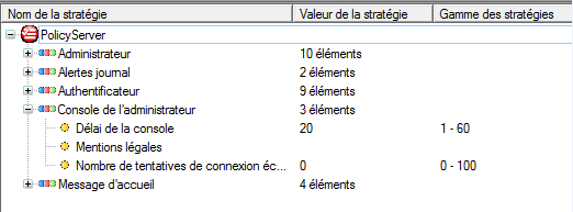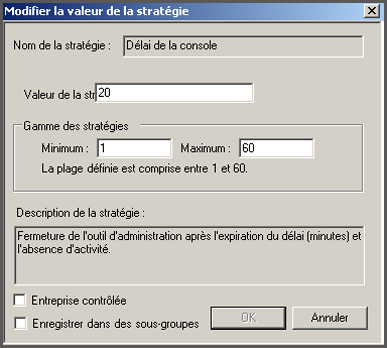 PolicyServer MMC dispose d'un ensemble commun de fenêtres pour modifier les stratégies. Différents types d'entrées sont disponibles en fonction de ce que la stratégie contrôle et des paramètres qui sont requis. Cette tâche donne un aperçu général de la modification d'une stratégie. Les étapes requises pour modifier une stratégie diffèrent de celles destinées à modifier une autre stratégie.