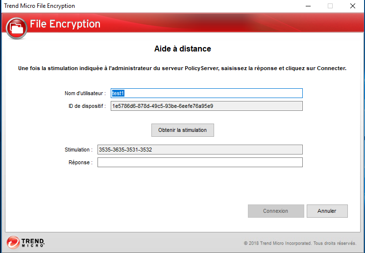 L'aide à distance permet aux utilisateurs de réinitialiser un mot de passe oublié ou un compte verrouillé. Tout utilisateur Endpoint Encryption dont le compte a été verrouillé ou qui a oublié le mot de passe du compte doit réinitialiser le mot de passe avant de pouvoir se connecter à un périphérique Endpoint Encryption. L'aide a distance requiert que l'utilisateur contacte le Centre d'assistance pour obtenir une réponse à la stimulation. L'aide à distance ne nécessite pas une connexion réseau à PolicyServer.