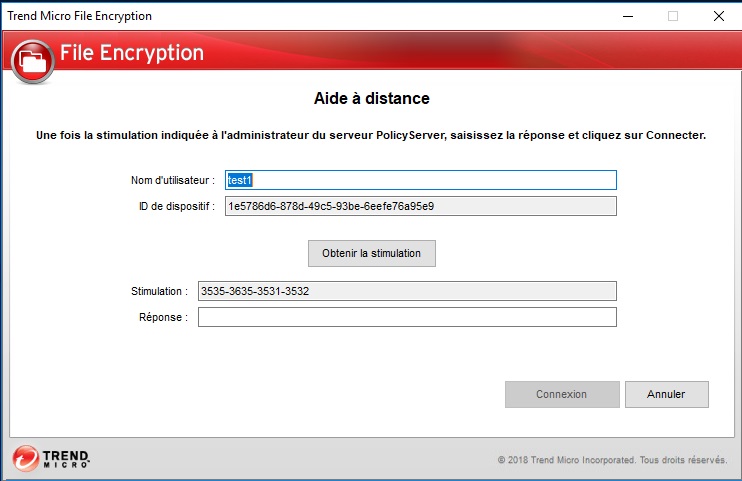 Lorsqu'un utilisateur dépasse le nombre de tentatives d'authentification et que les stratégies sont définies pour appliquer l'authentification à distance, File Encryption verrouille les dossiers Endpoint Encryption et avertit l'utilisateur que l'aide à distance est requise. L'utilisation de l'aide à distance pour déverrouiller File Encryption nécessite une assistance de la part de l'authentificateur de l'entreprise ou de l'authentificateur de groupe.