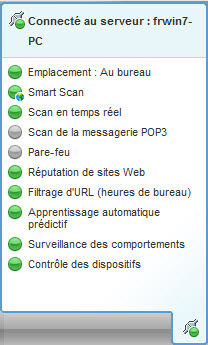 Non connecté à Security Server, mais le scan en temps réel est toujours en cours d’exécution. Le fichier de signatures n'est peut-être pas à jour. Faites un clic droit sur l'icône de l'agent dans la barre des tâches Windows, puis cliquez sur Mettre à jour. |