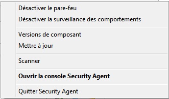 Des raccourcis vers les tâches fréquemment exécutées par les utilisateurs sont disponibles en cliquant avec le bouton droit sur l’icône Agent de sécurité de la barre des tâches Windows.